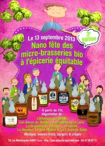 La 3eme édition de la Nano fête des micros brasseries bios se tiendra à l’Epicerie Equitable au 78 rue montesquieu, à Lyon, le vendredi 13 septembre 2013 à partir de 17h. 9 brasseurs bio du Rhône, de l’Ain, de l’Isère, de la Loire, Franche-Comté et du Nord vous feront découvrir à leurs bières artisanales à la pression ! Elles sont toutes préparées à base de produits issus de l’agriculture biologique. Chacune a reçu un soin particulier et une attention presque amoureuse du champ d’orge au verre de mousse.